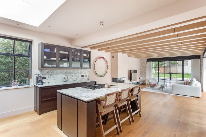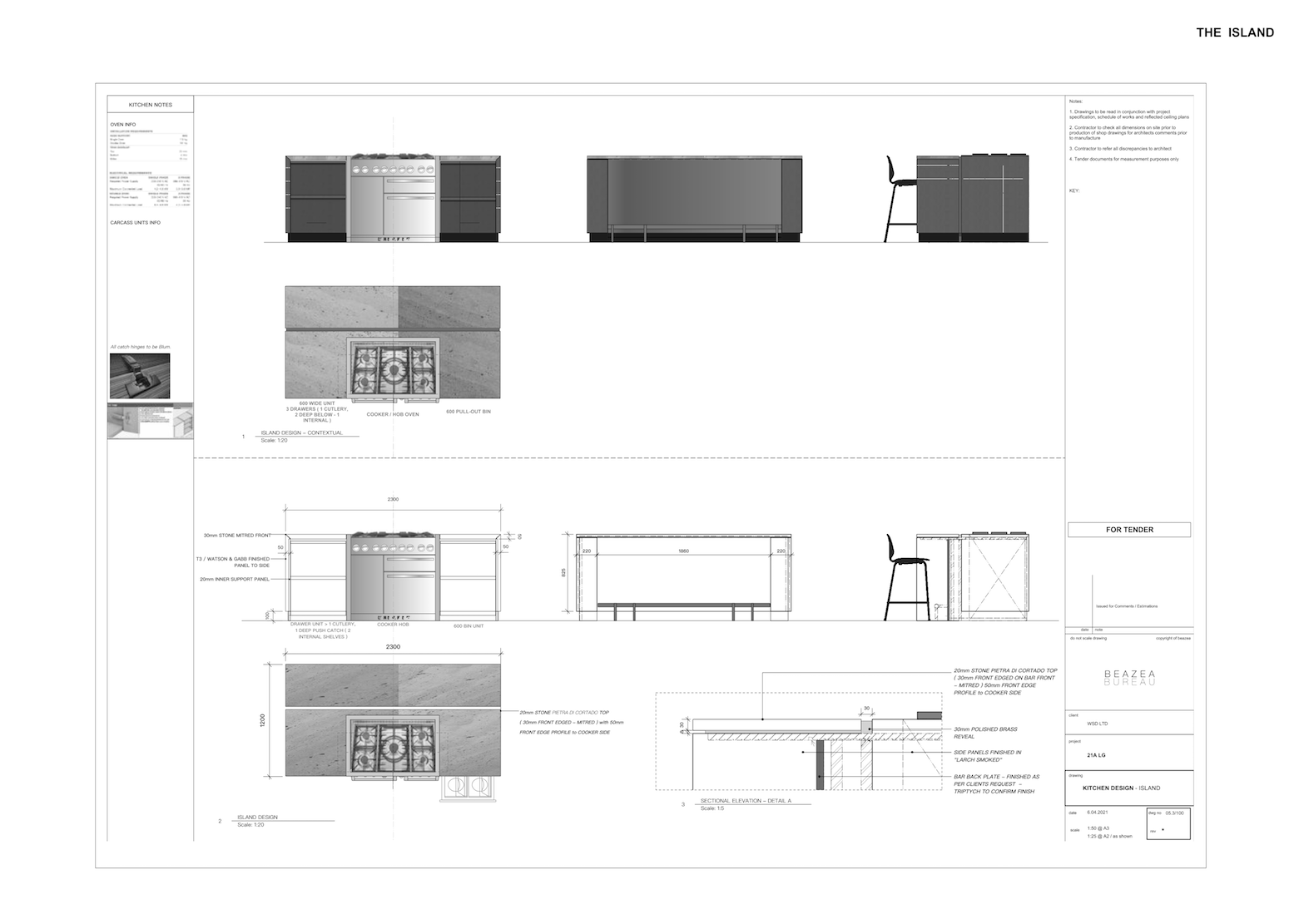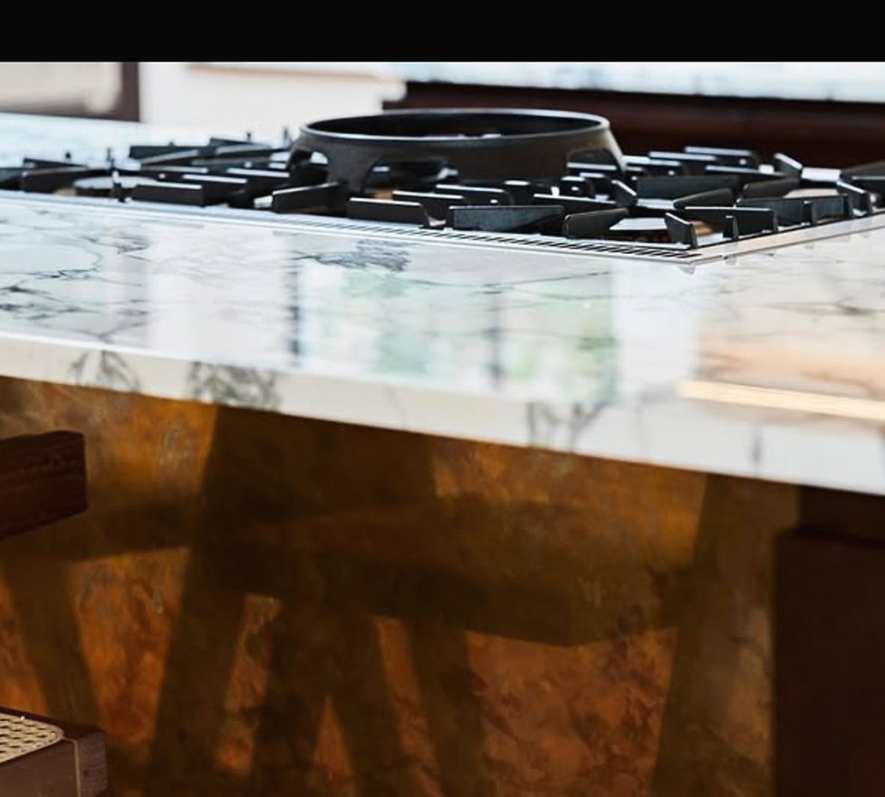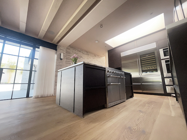 Bespoke Kitchen designed alongside client, relayed to Wiltshire England for further specific detailing and manufacturing. Housing Wolf Sub-Zero / Mercury Range, Island Hob, Polished Metal finish, Oak Veneered Units with Arabascatto Stone. Worked on-site for precision.